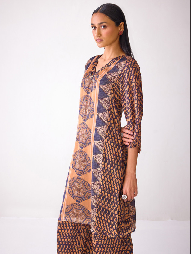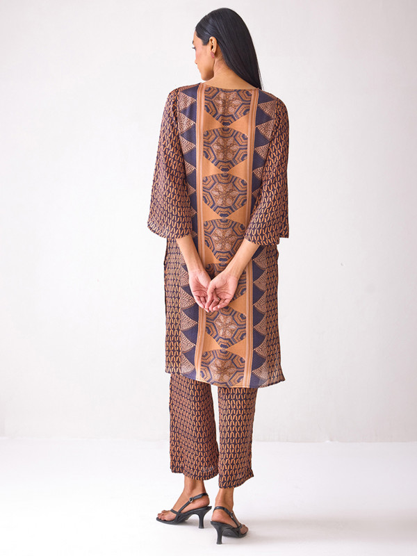 Rust Brown Printed Straight-fit Kurta with 3/4th sleeves and a V-neck, featuring a rich, earthy print that adds depth and character to the classic silhouette. The lightweight fabric ensures comfort throughout the day, while the sleeves offer a balanced look.