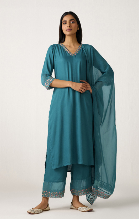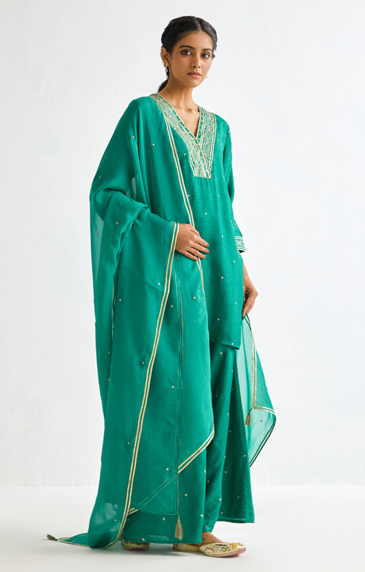 Office wear drapes ought to be structured yet modest. And the easiest way to achieve this balance is to wear the belted drape. Pair a palazzo with a long, structured kurti first, then wear the dupatta around your neck so that the ends face the front. Now, add a thin belt that is preferably the colour of your palazzos around the waist to complete the look. Remember, this style works well with a poufy dupatta like a tissue chanderi silk one or a cotton voile one. Don't have one in your closet? Shop one from our dupatta for women collection at Ancestry!