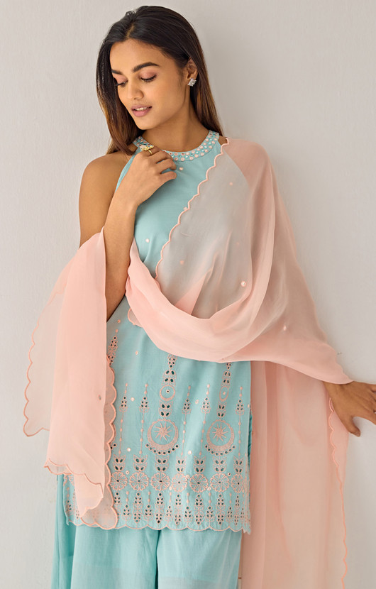 Silk dupattas need no special introduction. If you’re one for premium fabric, you can’t miss our silk dupattas featured on our drape for women collection. Our Neel Strip Dupatta is a sheer, tissue chanderi drape that comes in a deep and rich blue colour, accentuated with golden stripe patterns. Complete with a summer yellow contrast edging, this piece is the perfect pairing to an outfit with yellow details. Not much of a bright colour person? You might appreciate our dusty-rose toned Rosey dupatta. This piece has delicate floral embroidery around the edges, making it a simple but elegant accessory to your outfit.