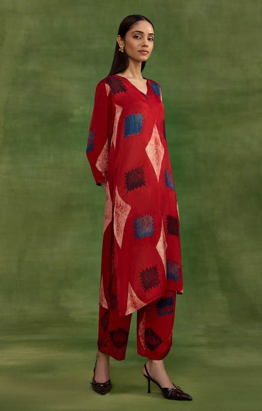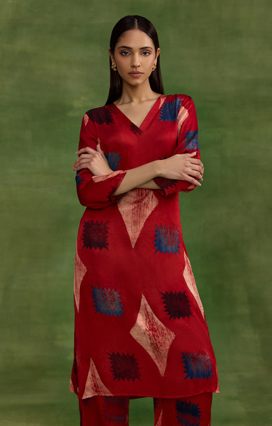 At Ancestry, we think festive looks are easily overdone, and hence we prefer to keep things subtle with our ladies kurta, and our fabrics and embellishments do the talking. The Laali Basic Kurti encapsulates this view. Made with delicate cotton silk chanderi, the bright red tunic adds a pop of colour, so it looks best with a cream-colored bottom with colourful mojaris paired with heavy earrings. Try out the kurti collection for special occasions.