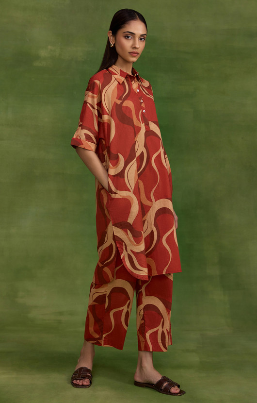 If you’re the modern Indian woman who’s all about unique cuts and drapes, the winter-toned Ajrak Kurta from our collection is sure to allure you. Being a front open ladies kurta, this piece is all about comfort. Its uniqueness lies in its asymmetric hem and textured Ajrak prints, a finish we could achieve thanks to the sturdy cotton dobby fabric. What’s more, it doesn’t skimp on details. It has cuffed sleeves, a collared neckline, and even comes with wooden buttons around the yoke and the cuff.