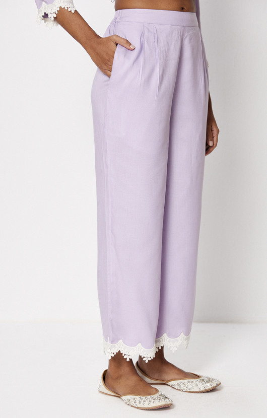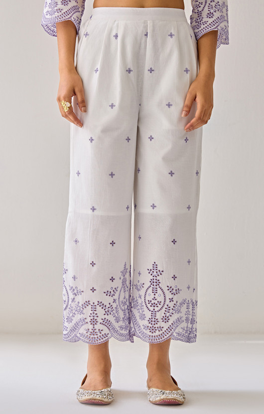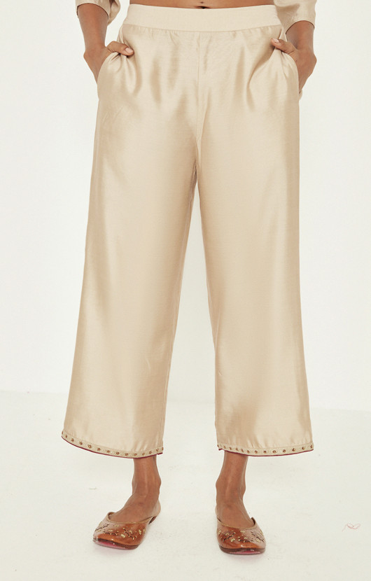 Ans. Trousers for women come in various styles, including straight pants, dhoti pants, wide-leg pants, flared trousers, cropped pants, palazzo pants, linen cotton embroidered pants, zardozi embroidered pants, cigarette pants, shararas, etc. Explore the vast collection of trousers for women at the Ancestry store.