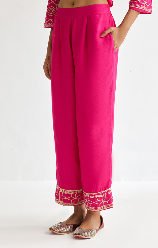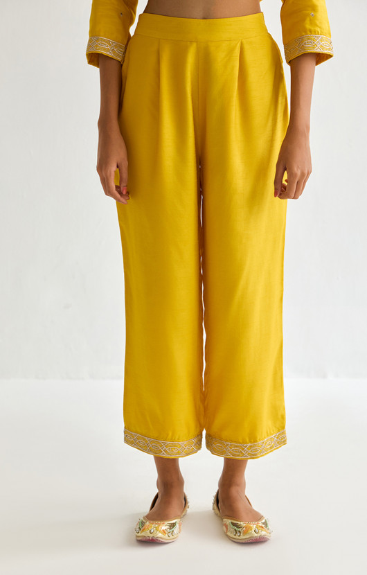 Ans. Trousers for women come in various styles, including straight pants, dhoti pants, wide-leg pants, flared trousers, cropped pants, palazzo pants, linen cotton embroidered pants, zardozi embroidered pants, cigarette pants, shararas, etc. Explore the vast collection of trousers for women at the Ancestry store.